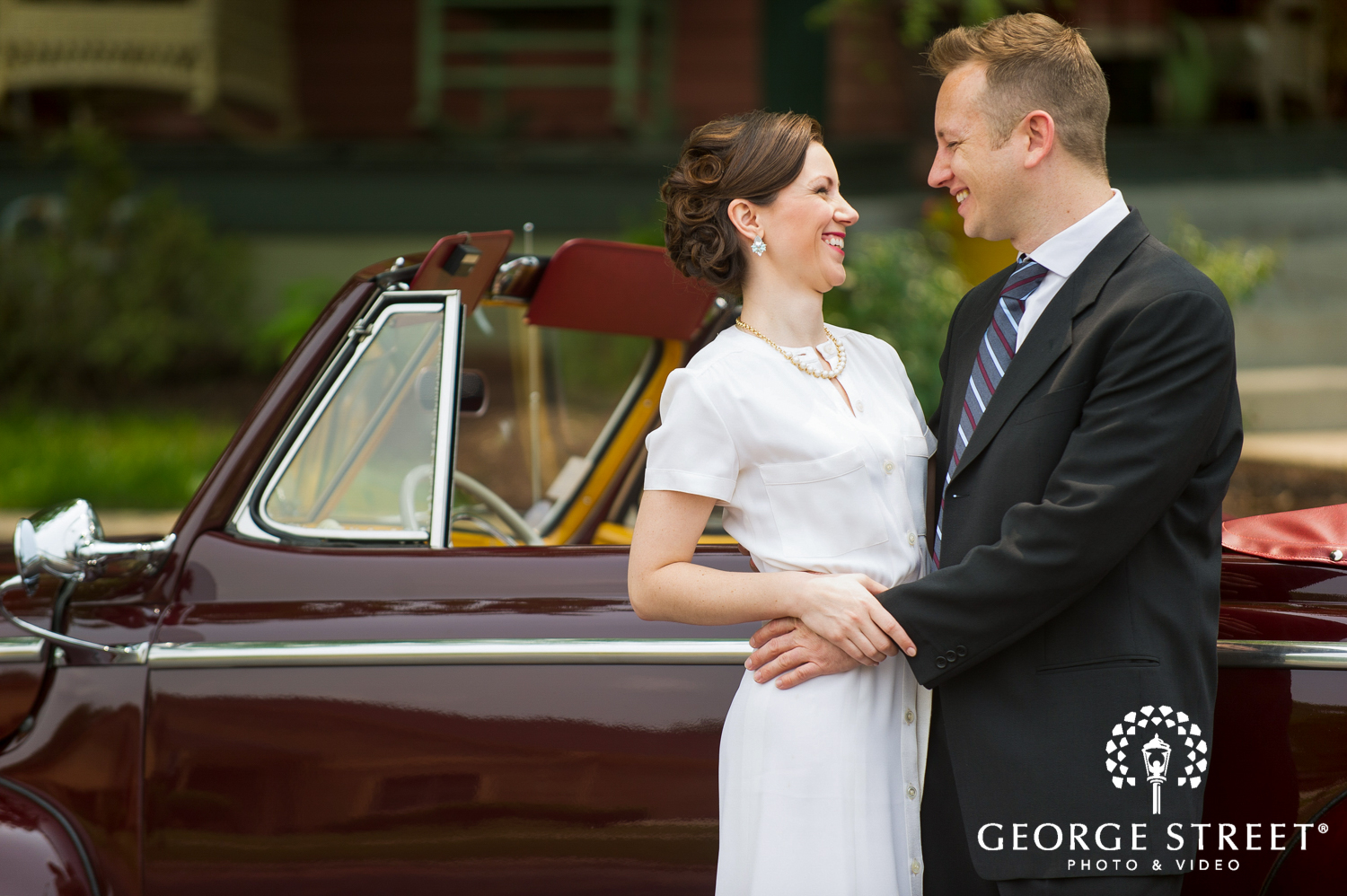 We absolutely adore this American Ford classic Super Deluxe 8. The pristine Ford model really sets the tone for this vintage session. The perfectly attired bride and groom-to-be make us feel like we have truly jumped back in time! With such a beautiful tree lined brick road in the background, we can't imagine a more picture perfect setting for such a unique couple!