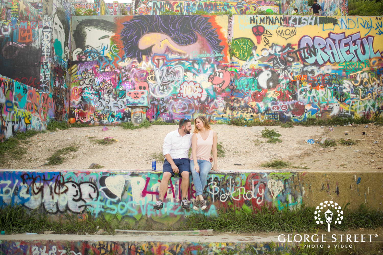 While you may be thinking of having a destination wedding, have you ever considered having a destination engagement shoot? This Baltimore-based couple headed to Austin to have their pictures taken. First up was the cool, urban feel of the Baylor Street Art Wall.