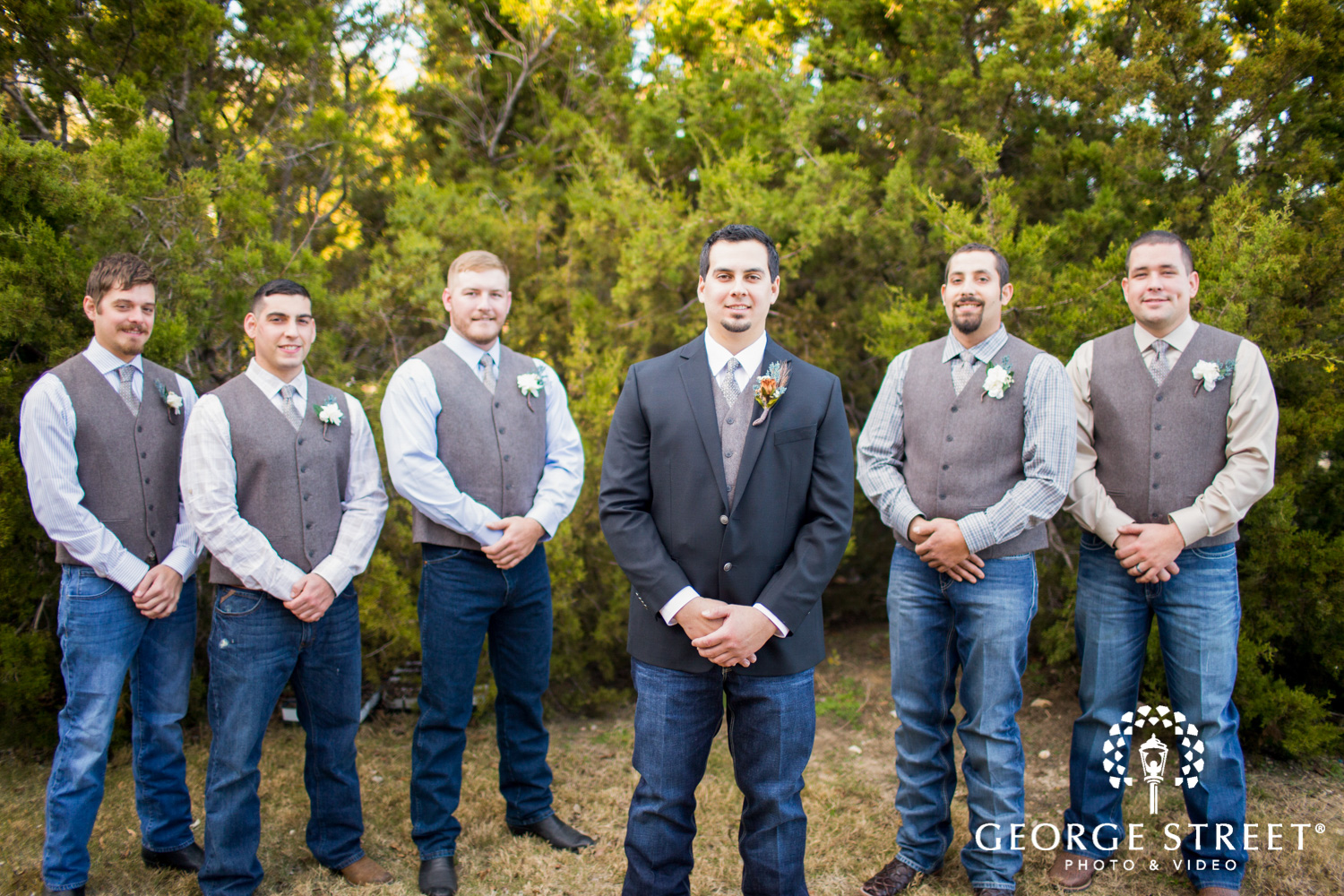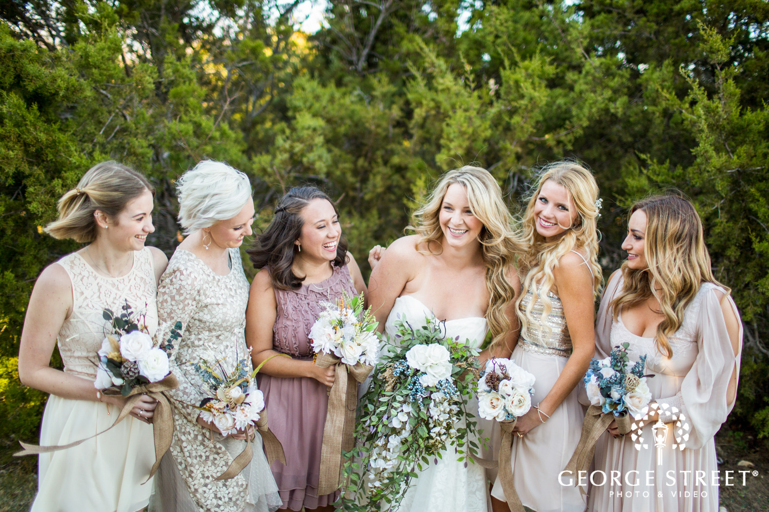 We absolutely adore the bridesmaids looks. Their mismatched dresses are the perfect length to show off their cowboy boots as well! By keeping a neutral color palette, the bridesmaids look cohesive while also showing off their personality and individual style. We also love the unique combination of bouquets made with a variety of blooms, pinecones and greenery.