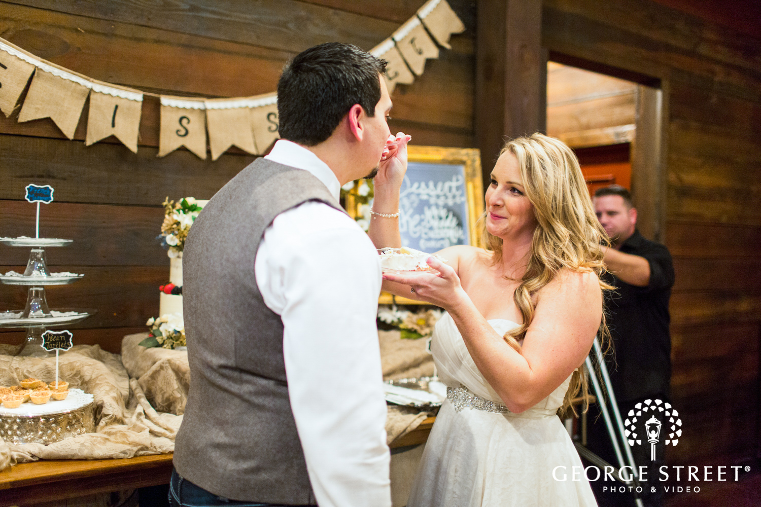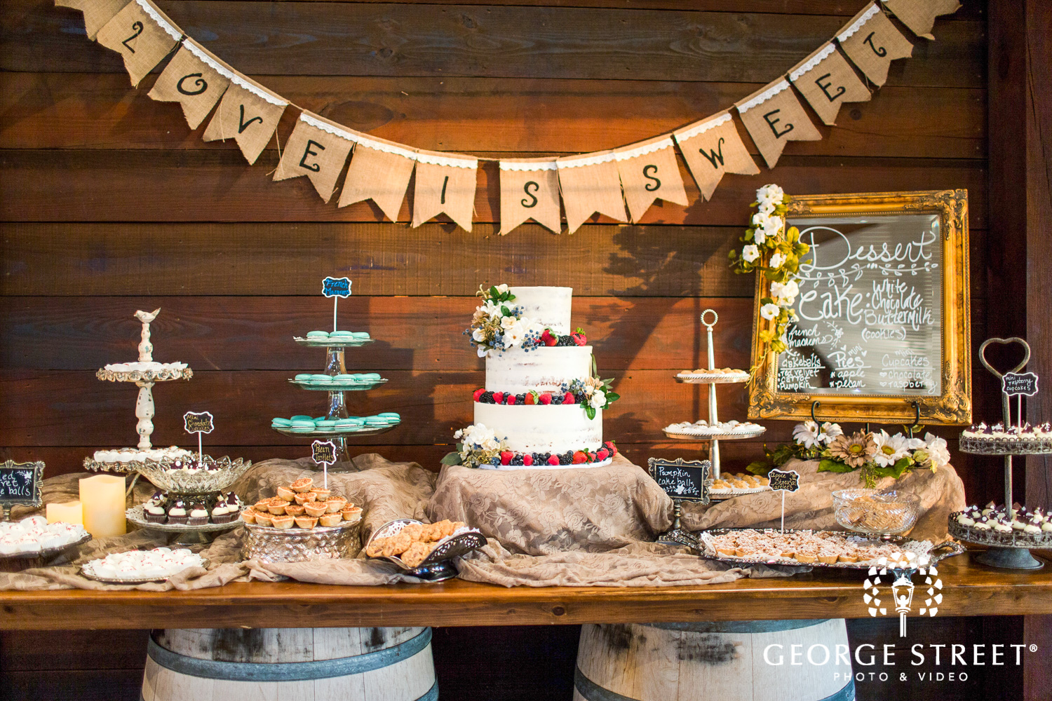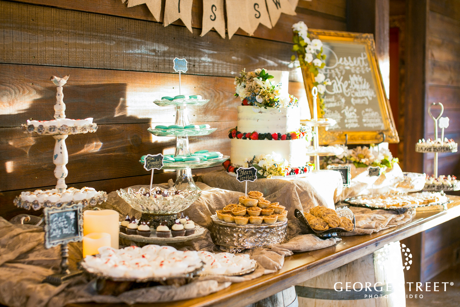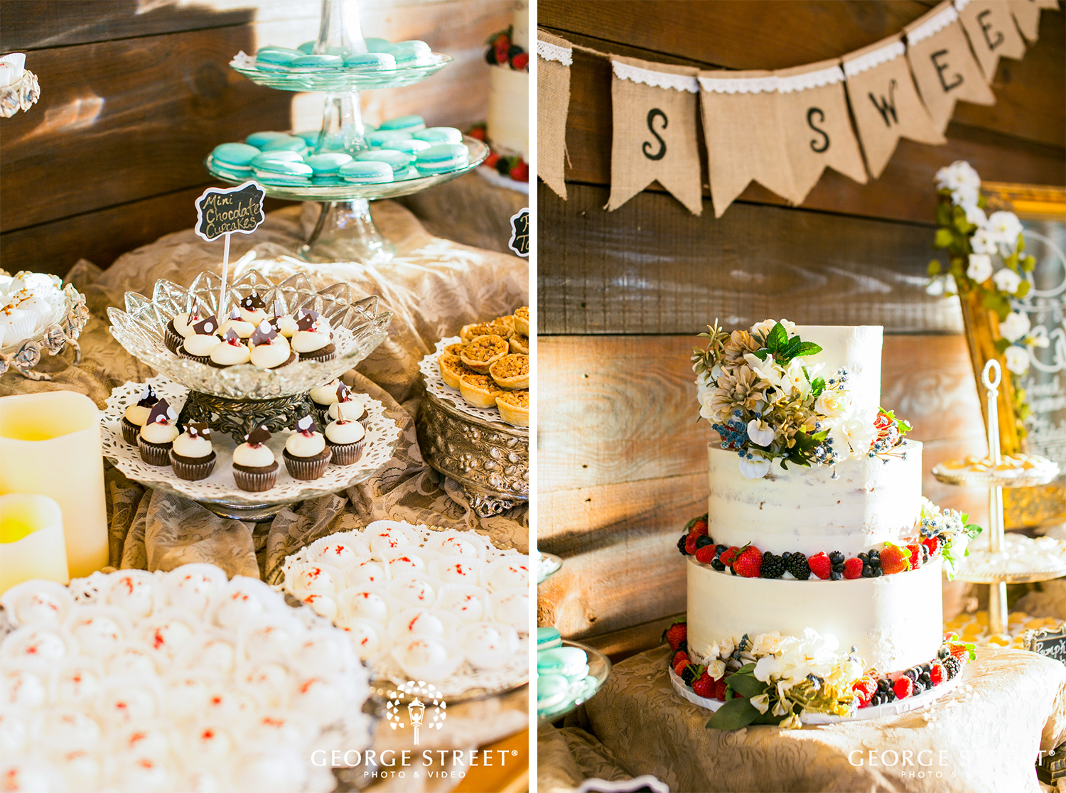 Thistle Springs Ranch provided the perfect location for a rustic reception. Heather and Robert chose to include a variety of treats for their guests. From macarons to cupcakes, and of course, a gorgeous wedding cake, there was a little something for everyone. We love the unique variety of cake stands and dessert displays included on this dessert table!
