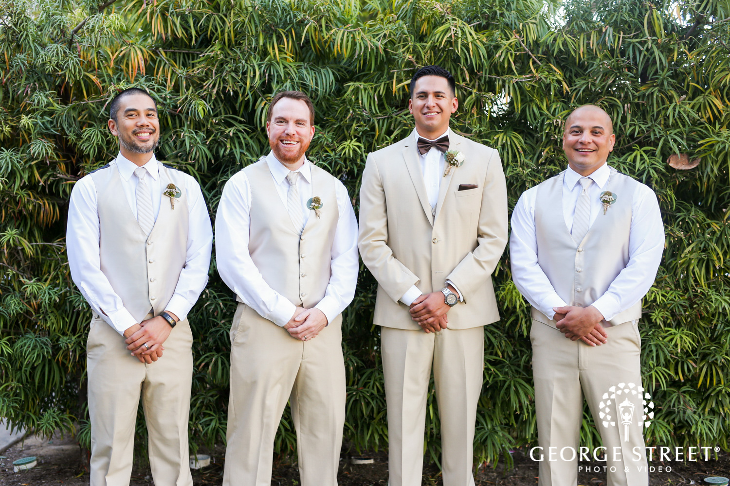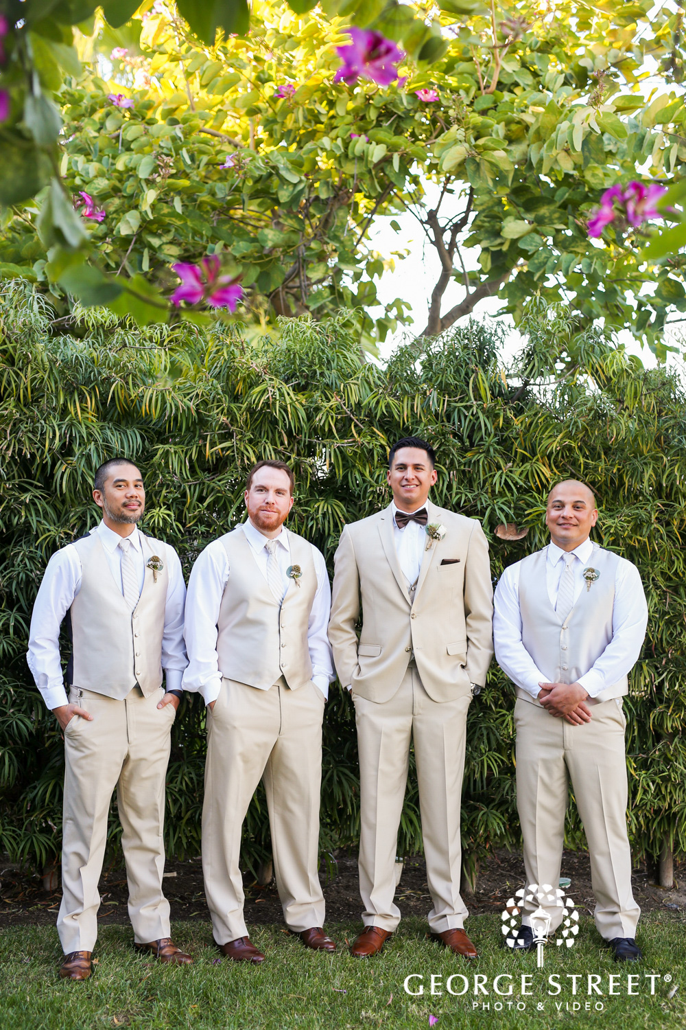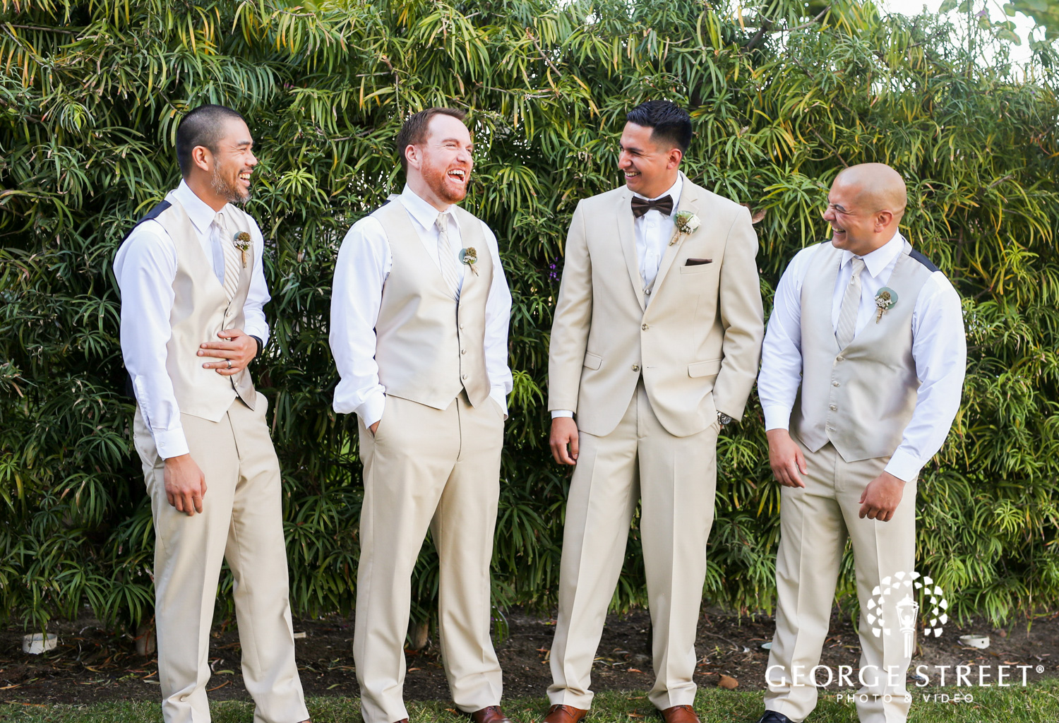 Our blushing bride looked positively radiant in her gorgeous wedding gown. The dreamy sleeveless gown featured a V-neckline with a lace overlay, tulle A-line skirt, and a satin ribbon at the waist to tie it all together. Neutral and pastel colors can help to create a bright and airy feel to any wedding, and this one certainly takes the cake! Joanne’s bridesmaids looked simply stunning by her side! Oscar and his groomsmen continue with the neutral theme with cream suits, simple boutonnieres, and a perfectly placed pocket square on our groom.