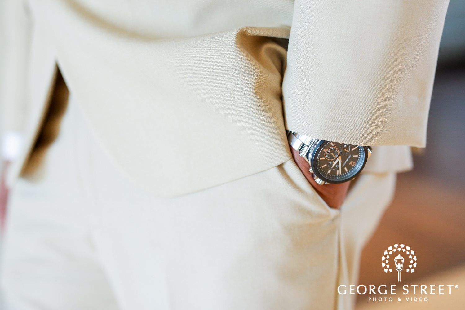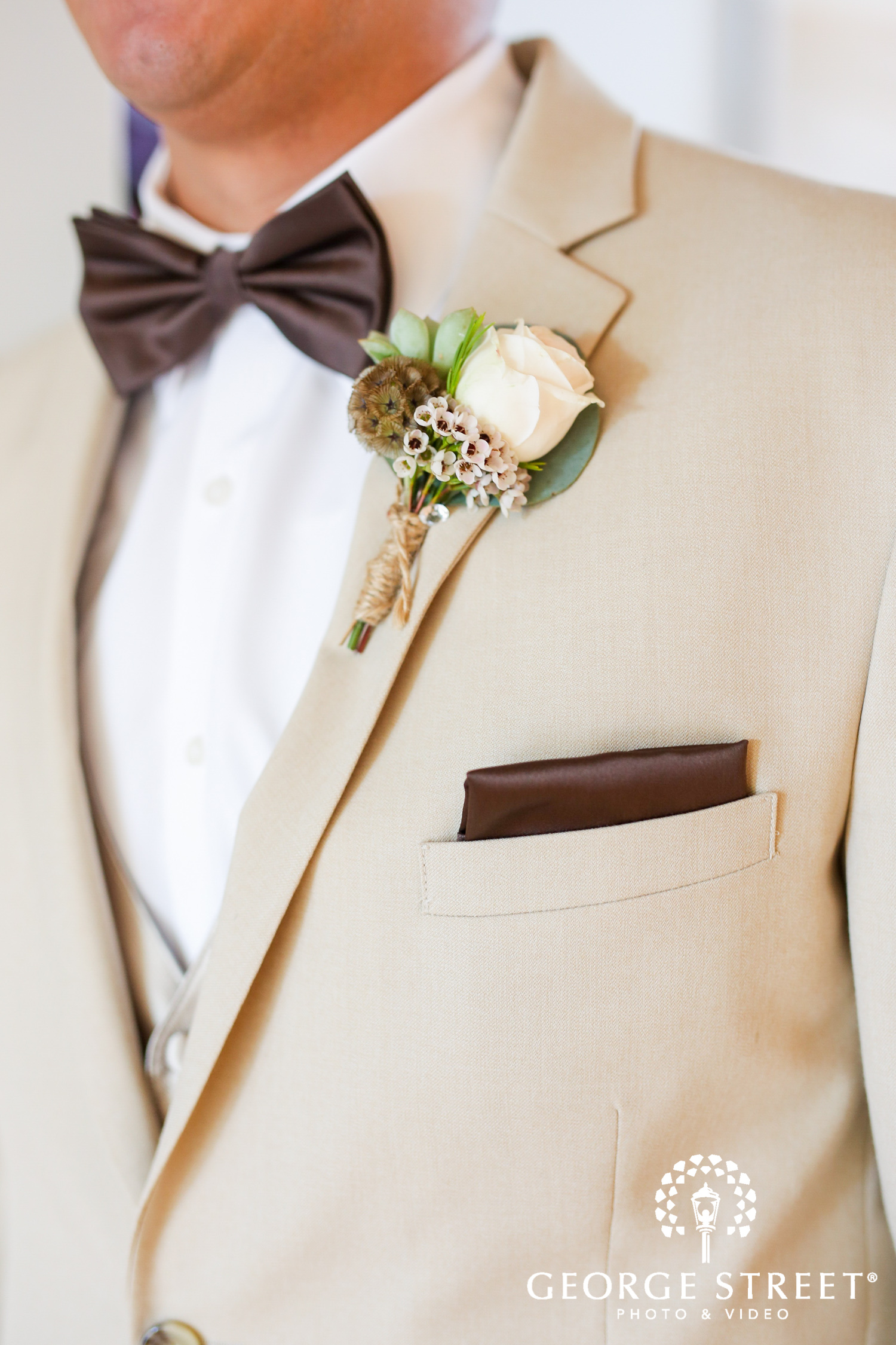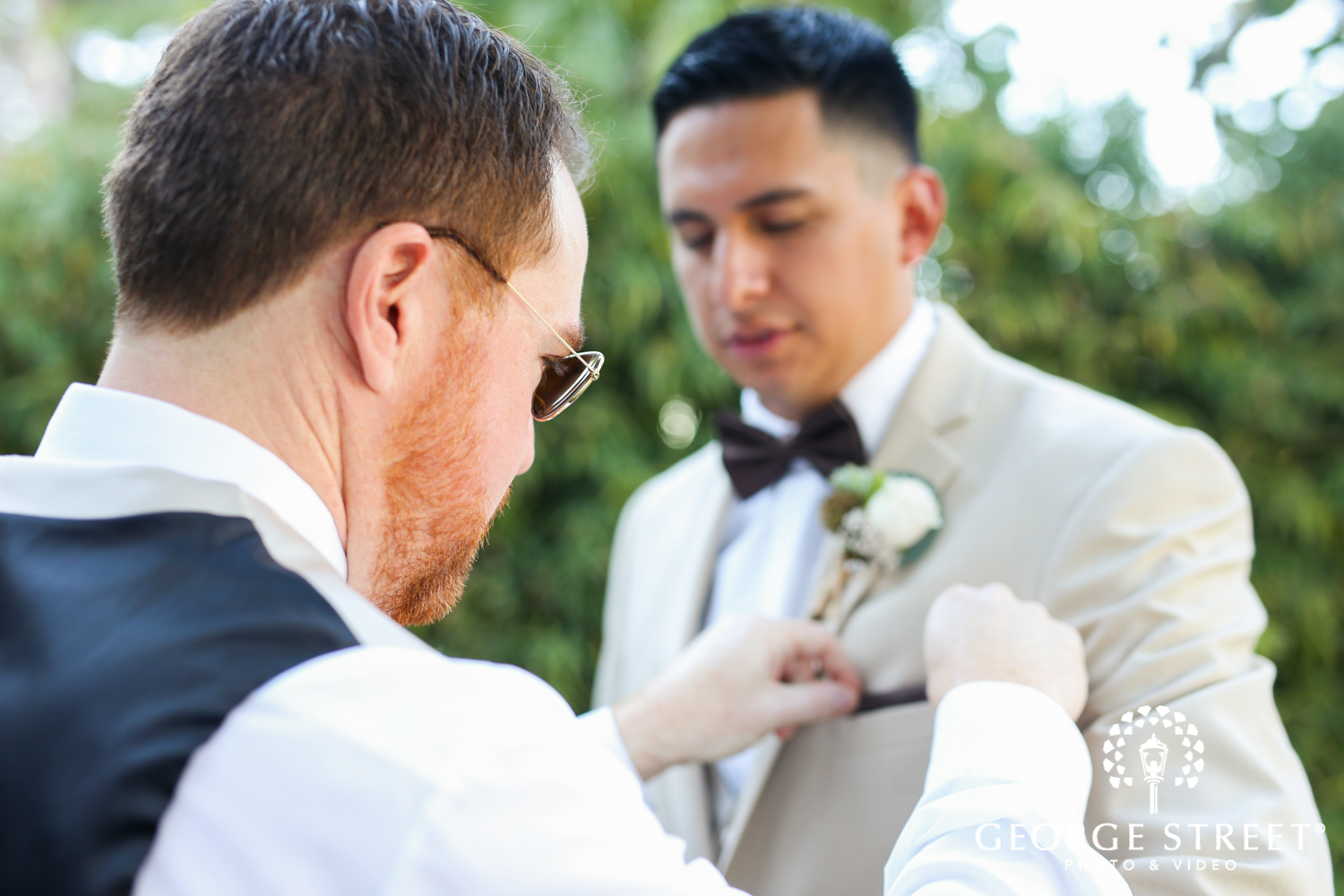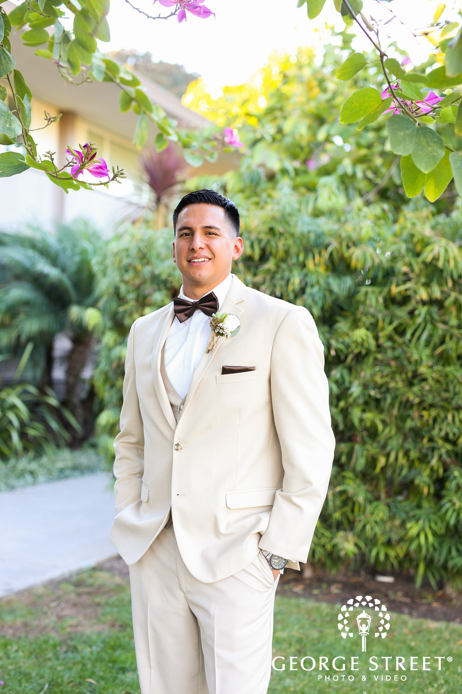 Our blushing bride looked positively radiant in her gorgeous wedding gown. The dreamy sleeveless gown featured a V-neckline with a lace overlay, tulle A-line skirt, and a satin ribbon at the waist to tie it all together. Neutral and pastel colors can help to create a bright and airy feel to any wedding, and this one certainly takes the cake! Joanne’s bridesmaids looked simply stunning by her side! Oscar and his groomsmen continue with the neutral theme with cream suits, simple boutonnieres, and a perfectly placed pocket square on our groom.