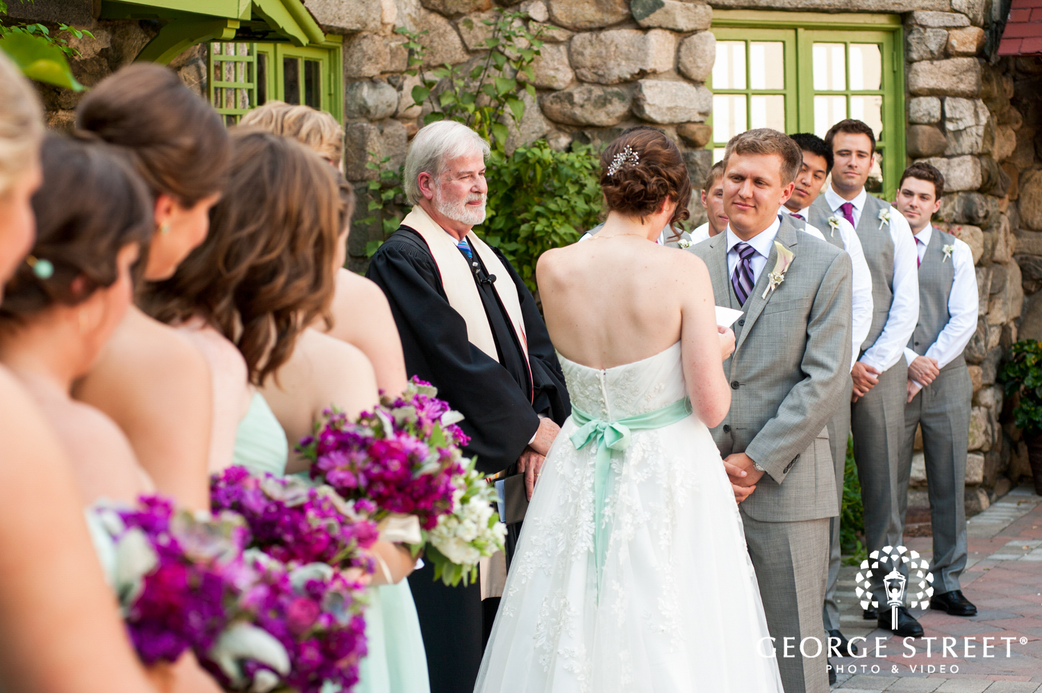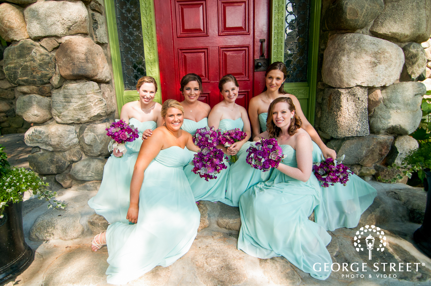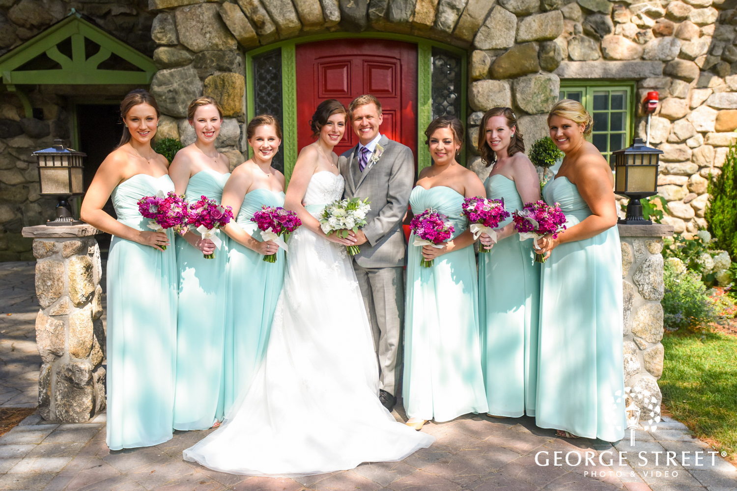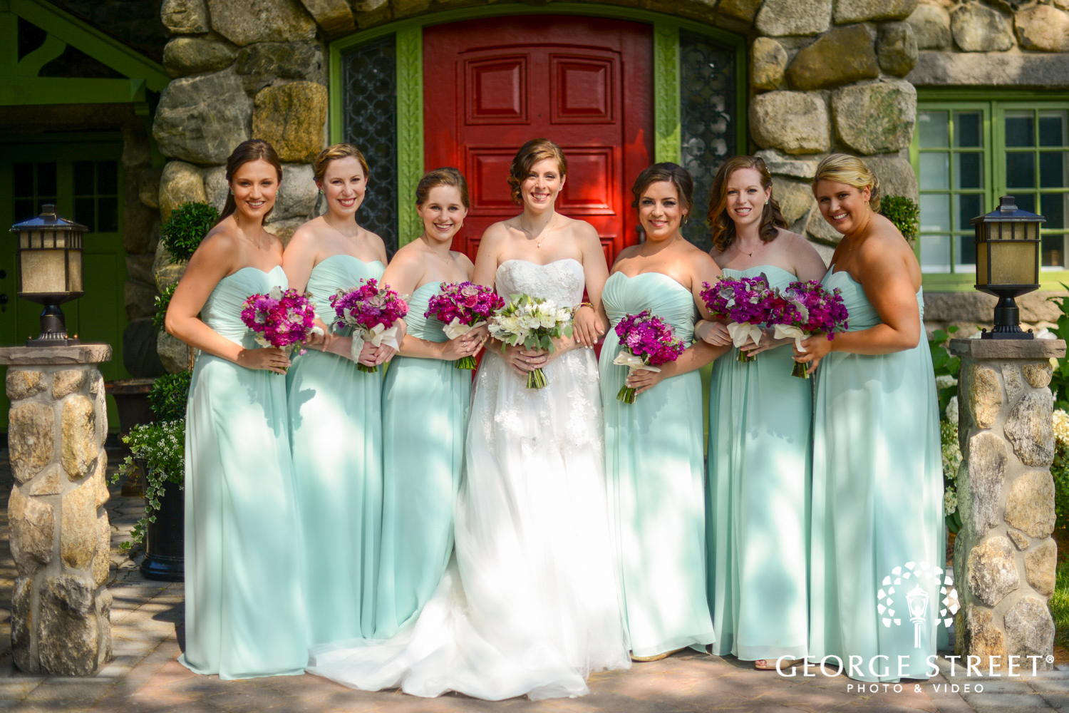 The ceremony and reception were held at Willowdale Estate, a location we won’t soon forget! With its gorgeous cobbled exteriors and ivy covered walls, this venue looks like it came straight out of a fairytale. The vibrantly dressed bridal party, abundance of greenery and open courtyard all came together perfectly to create a dreamy and whimsical atmosphere for Kathryn & Alex’s wedding day.