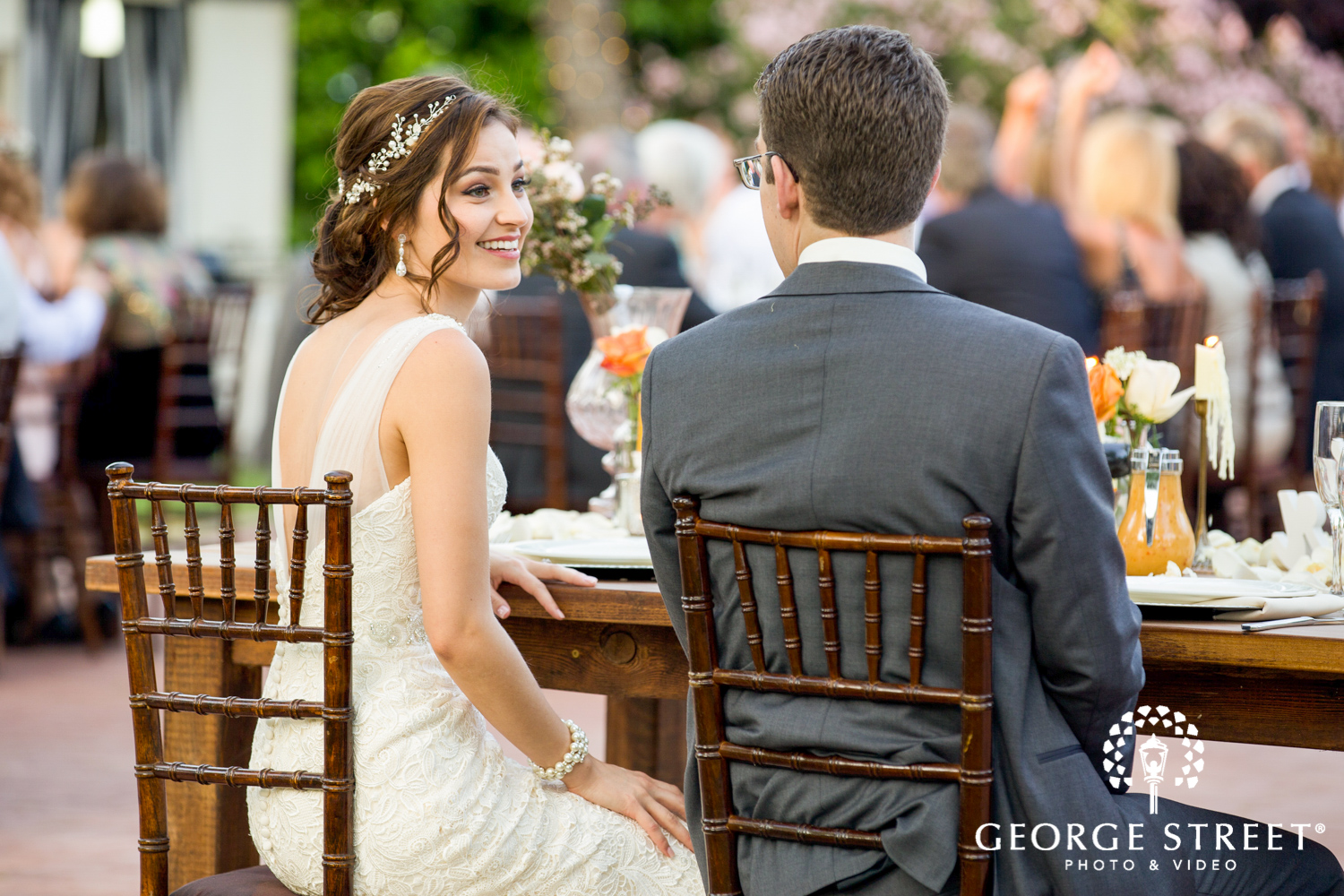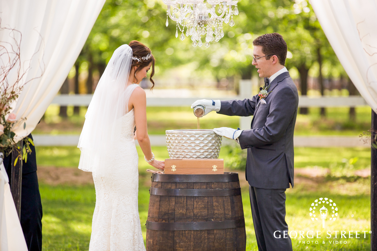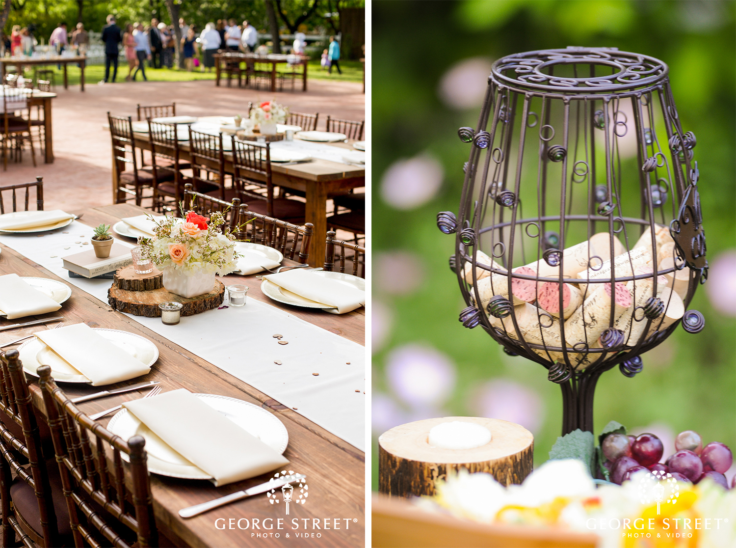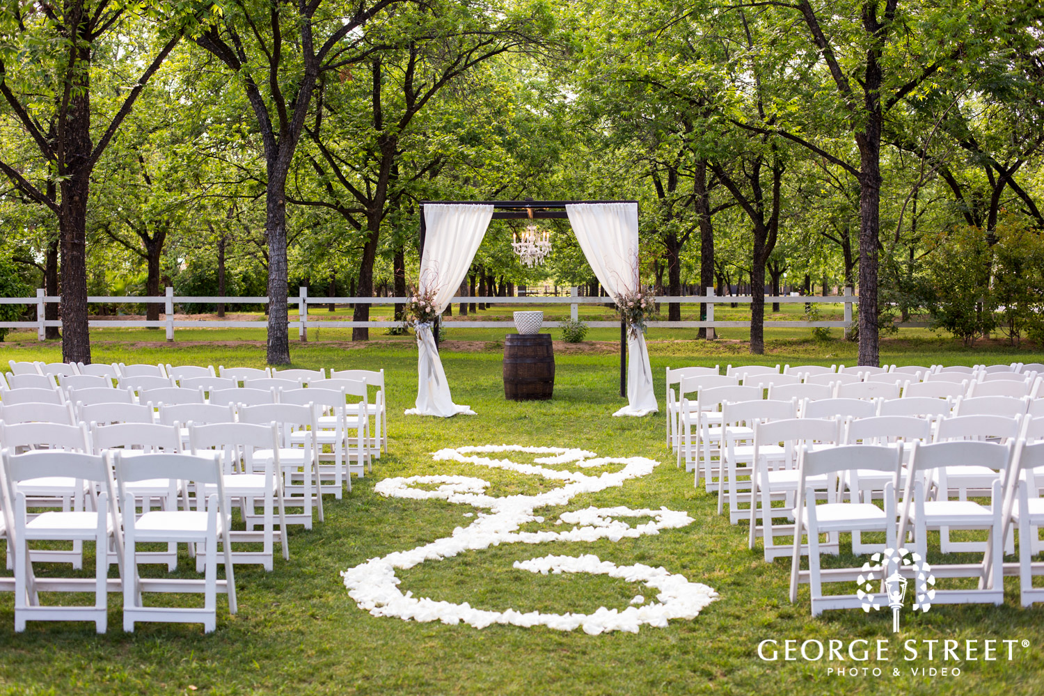 The effortless, rustic vibe of this outdoor wedding is easy to recreate without breaking the bank. The classic white décor paired with dark wood tabletop accents looks elegant and timeless. Paired with a few simple decorative accent centerpieces, this sweet and simple reception space makes for the perfect place to dance the night away!