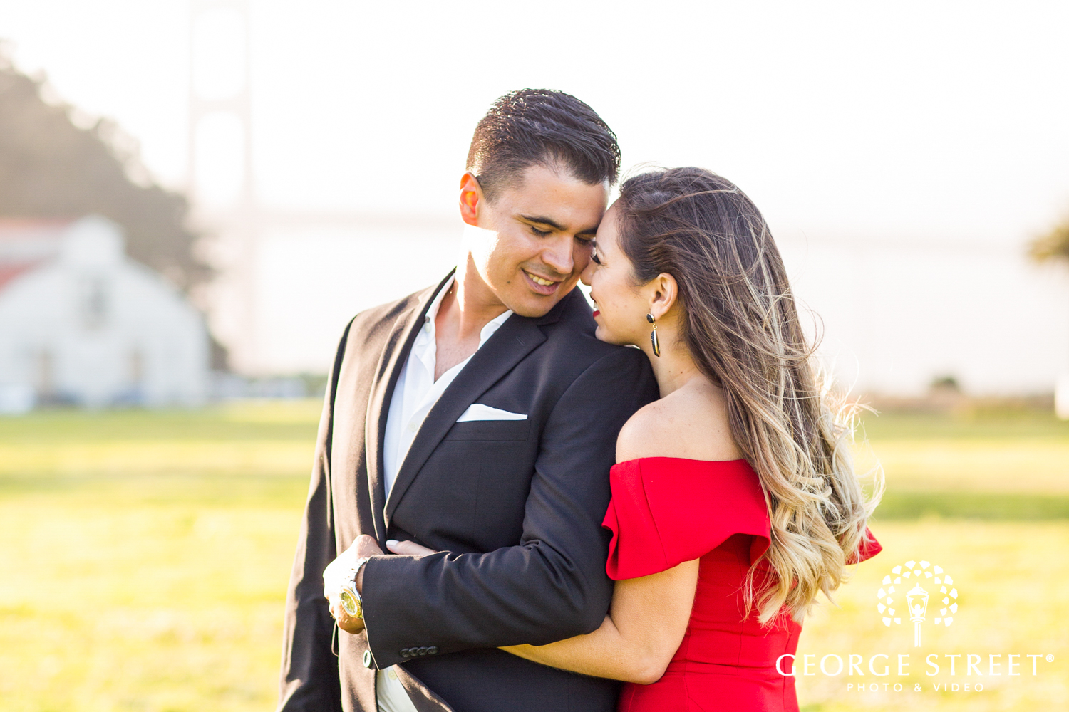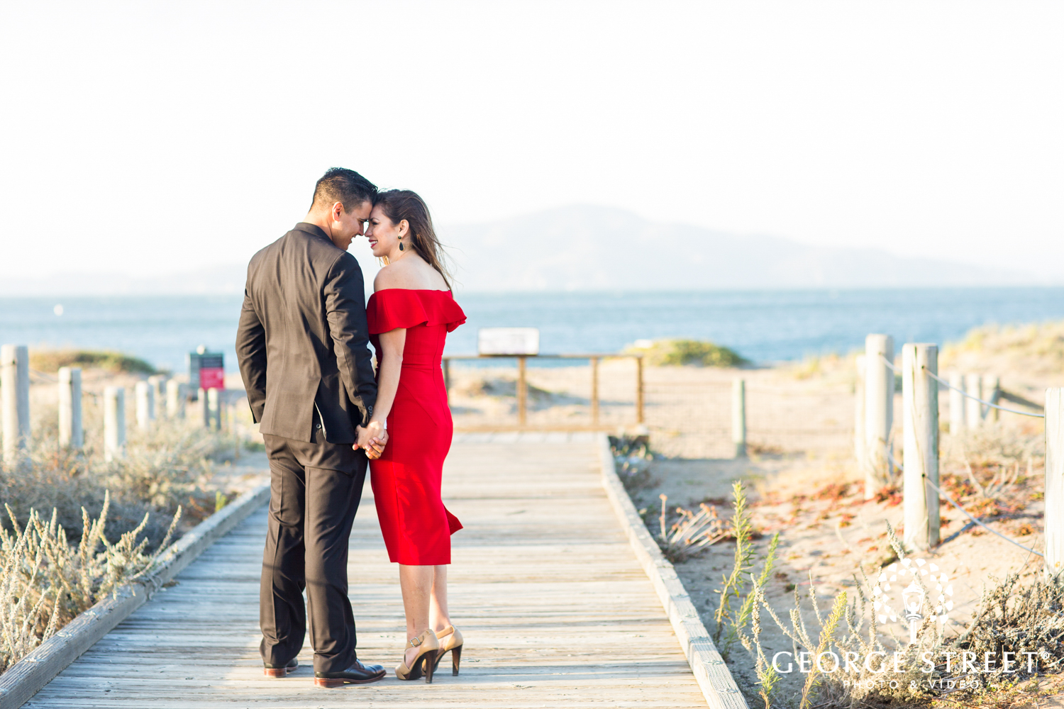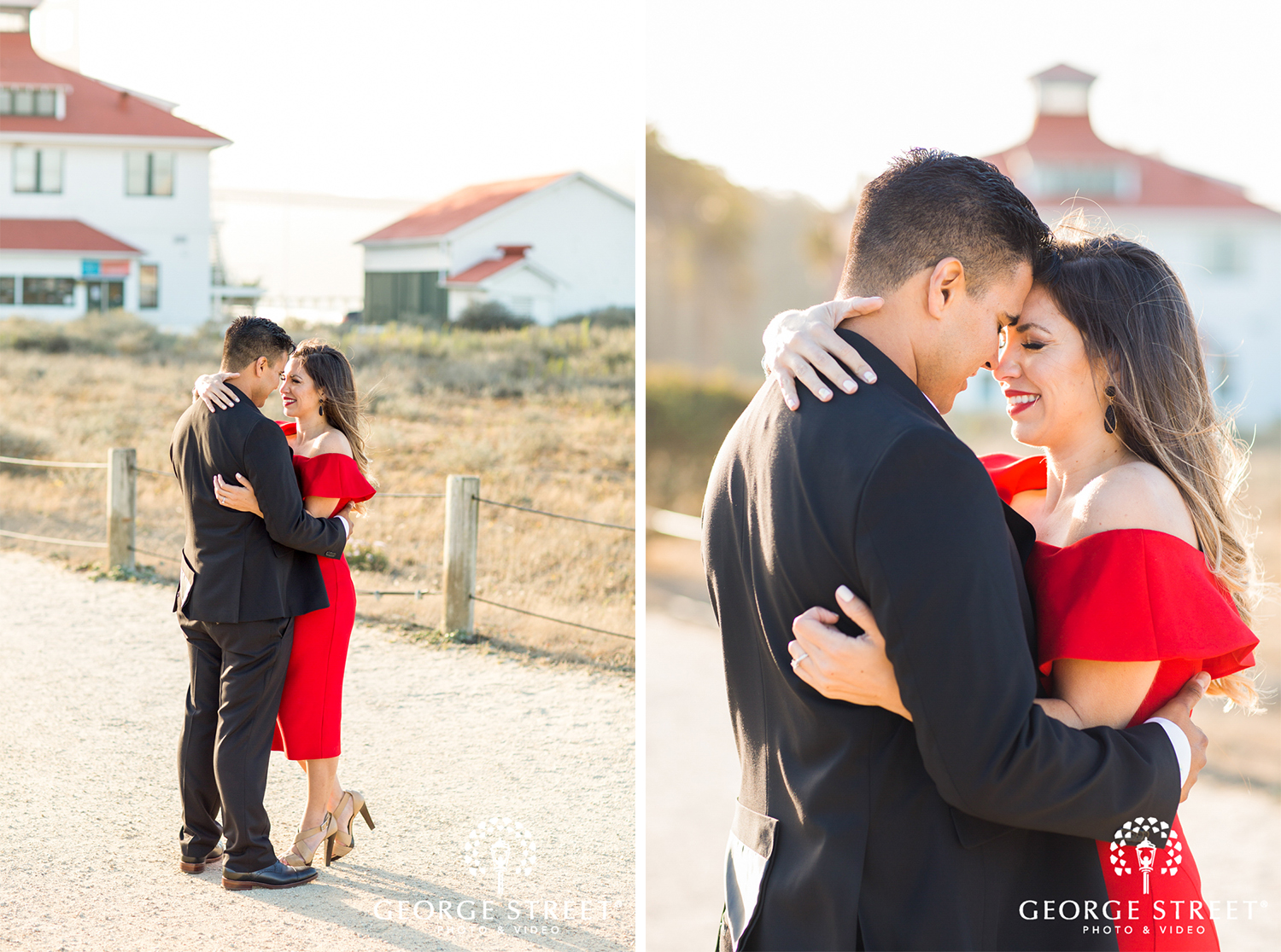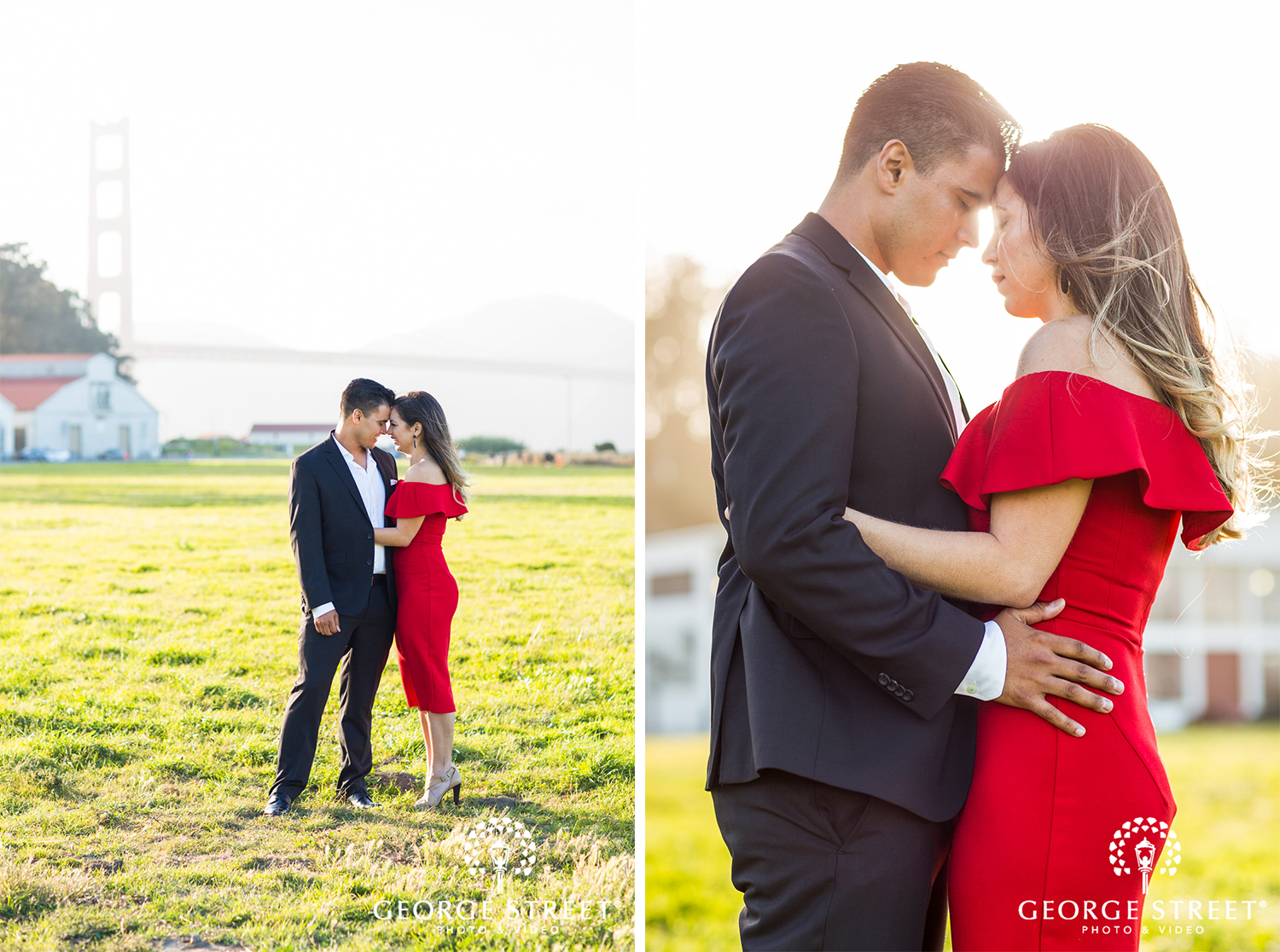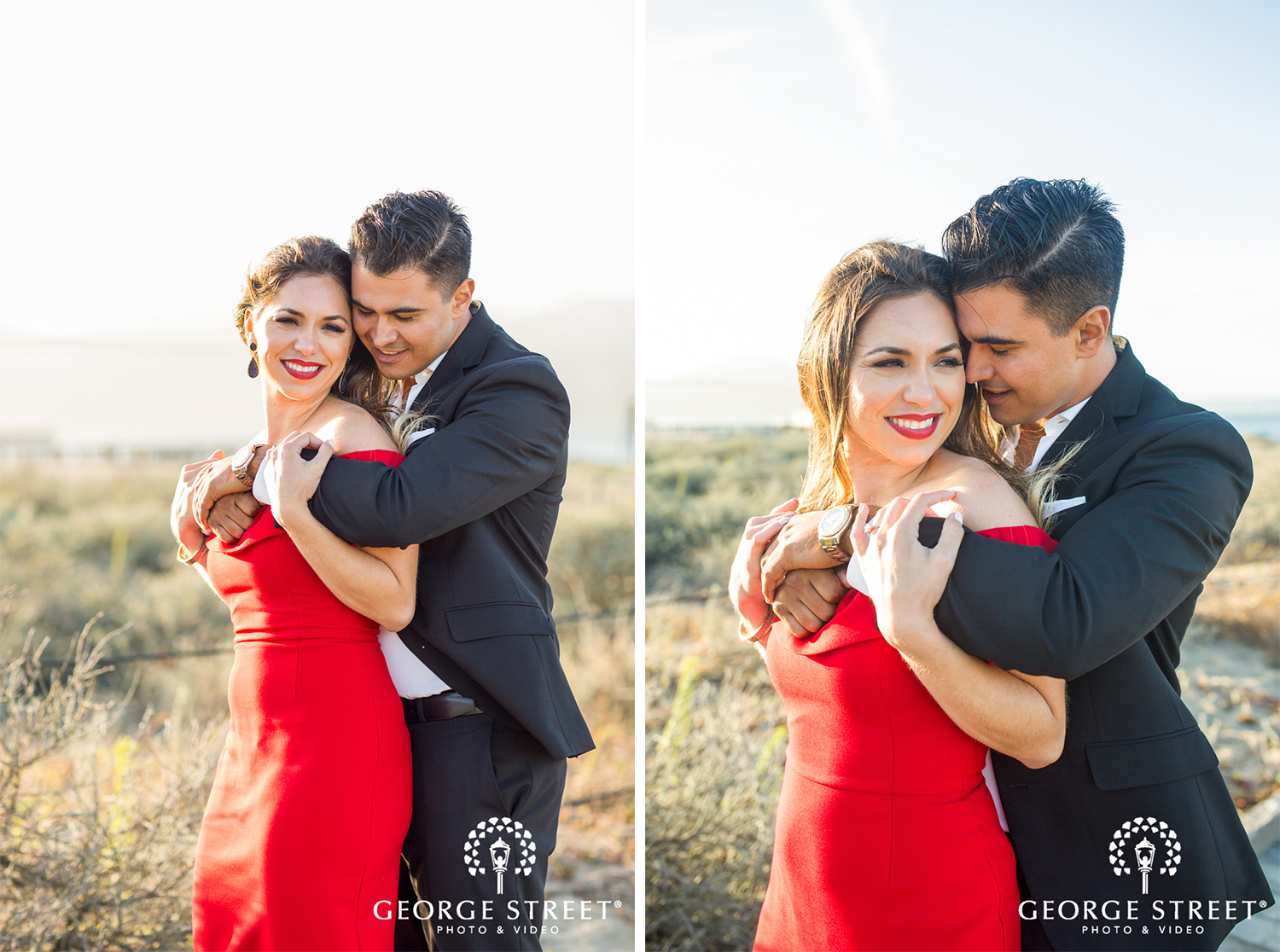 Vanessa and Daniel chose a mixture of formal attire with a playful vibe. The bride-to-be opted for a flowy pastel number before changing into a vibrant red cocktail dress for the second half of their portraits. A sharp black suit compliments both dress choices perfectly, resulting in a truly stylish session!