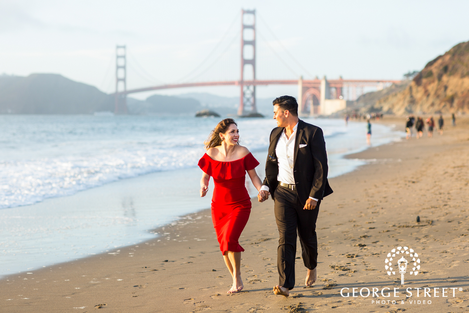 cheerful beach engagement photography golden gate bridge