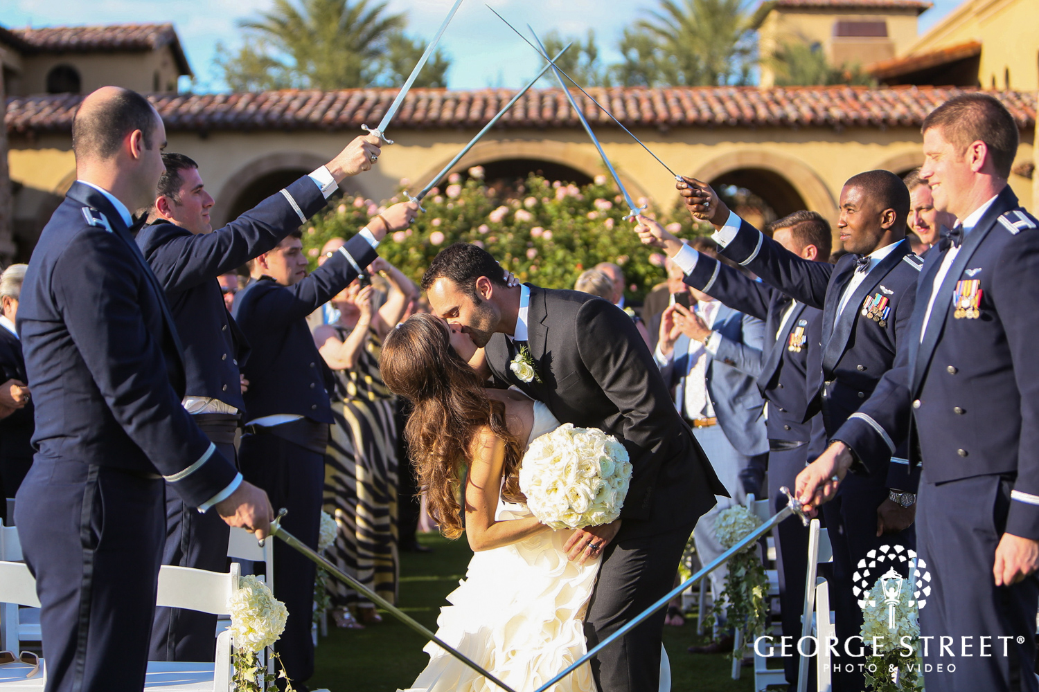 The Arch of the Sabres/Swords is one of the many military wedding traditions of several different branches with each branch maintaining a slightly different variation. True for all, only the bride and groom can pass under the swords, and this is done as a way to welcome the couple into their military family, or in this case, their Air Force family. It also symbolizes a pledge of loyalty to the couple from their service branch in return.